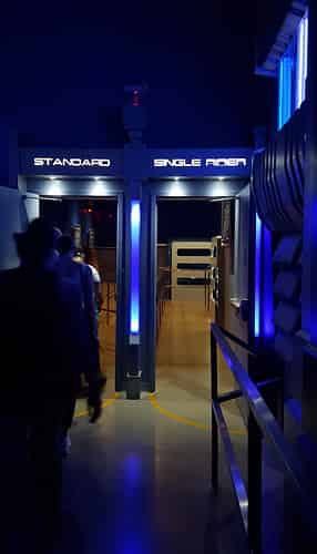 Riders then move from the preshow towards the loading area, with single riders given an option to bypass the last bit of the line.