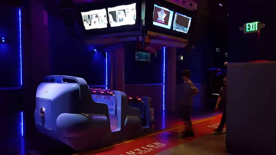 The "tactical assault hovercrafts" hold 6 people, and are mounted on a motion base that can tilt and rotate.