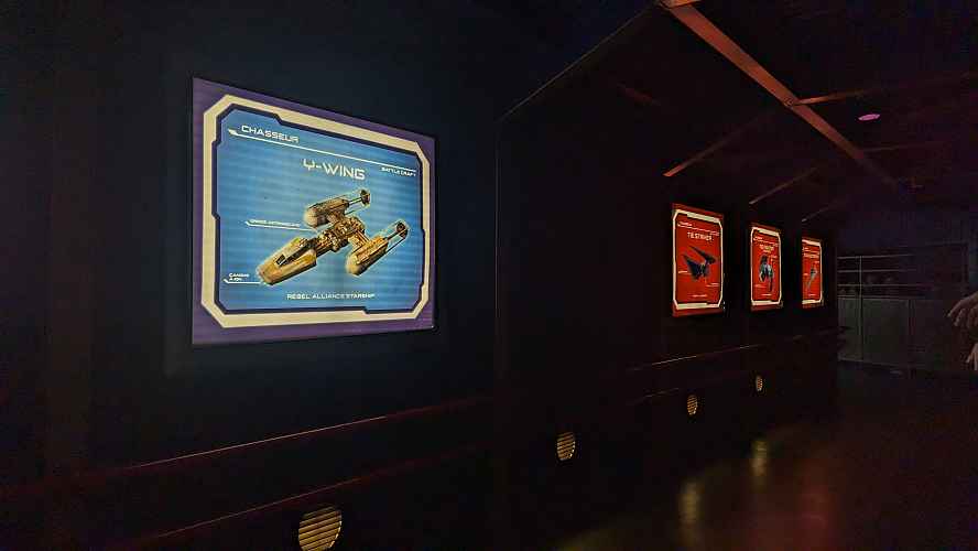 The ride features a sidewinder, corkscrew and cutback element in the dark, with plenty of drops and curves. Projections on the walls show a battle from Star Wars
