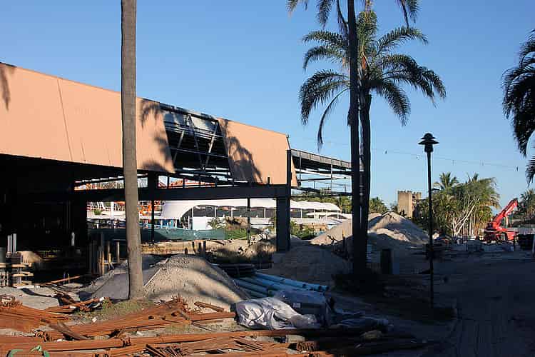 The two slots in the concrete are where the coaster track will sit. Matching slots can be seen on the far side. The area to the left on this far side is where the ride's transfer track will sit, with maintenance taking place along this left side towards Jet Rescue.