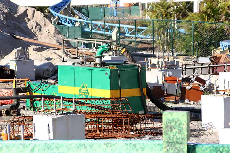 Pumps continue to operate to keep the low construction site dry while earthworks take place.