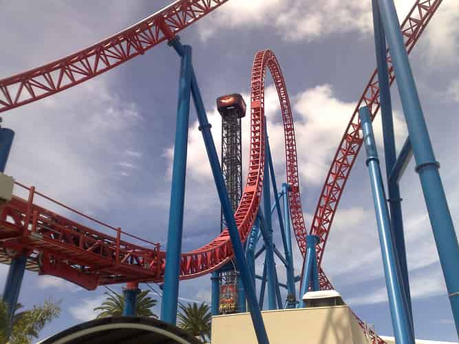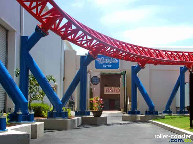 Superman Escape's 3 airtime hills, Batwing Spaceshot's tower and Lethal Weapon's lift hill can all be seen from the front of the park.