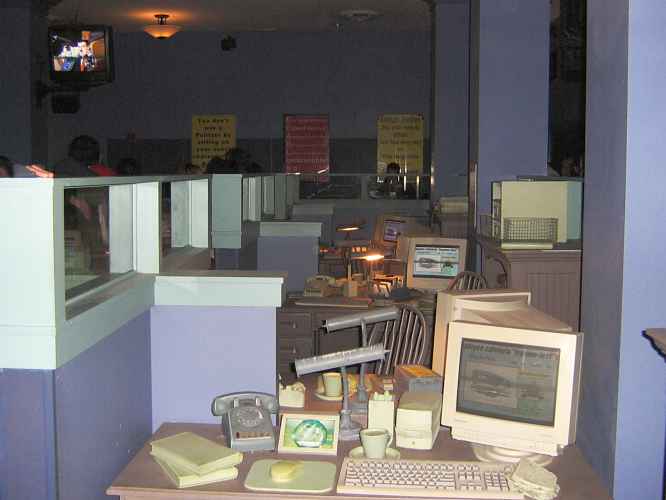 From the lobby the queue winds back and forth through the workstations of the newspaper.