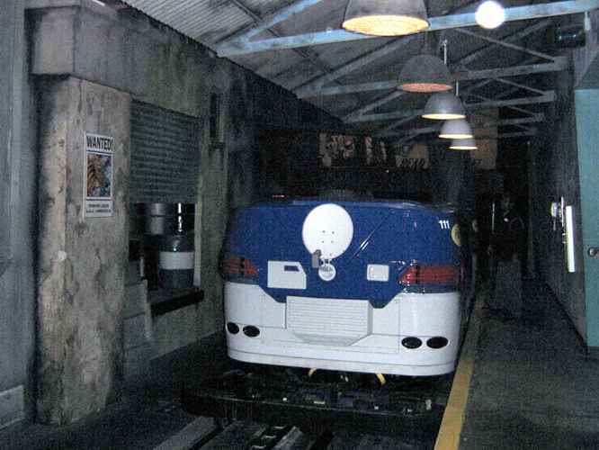 A vehicle heading off into the ride. The vehicles are capable of rotating, tilting and pitching.