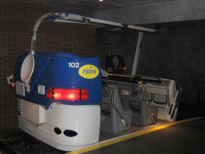 The vehicles, known as "Scoops" have high screens on each side to keep riders focused fowards, so the projected images have the greatest impact.