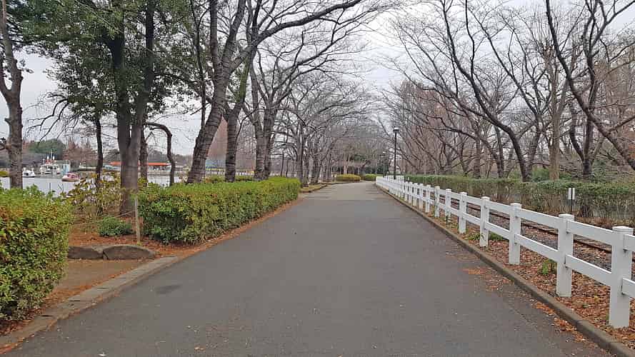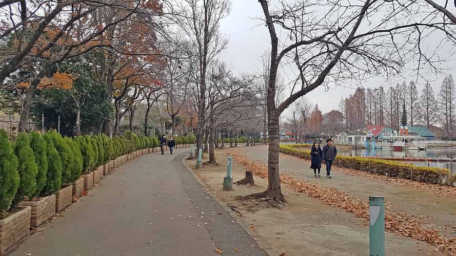A tree lined walkway along the lake from the main entrance to the amusement area.