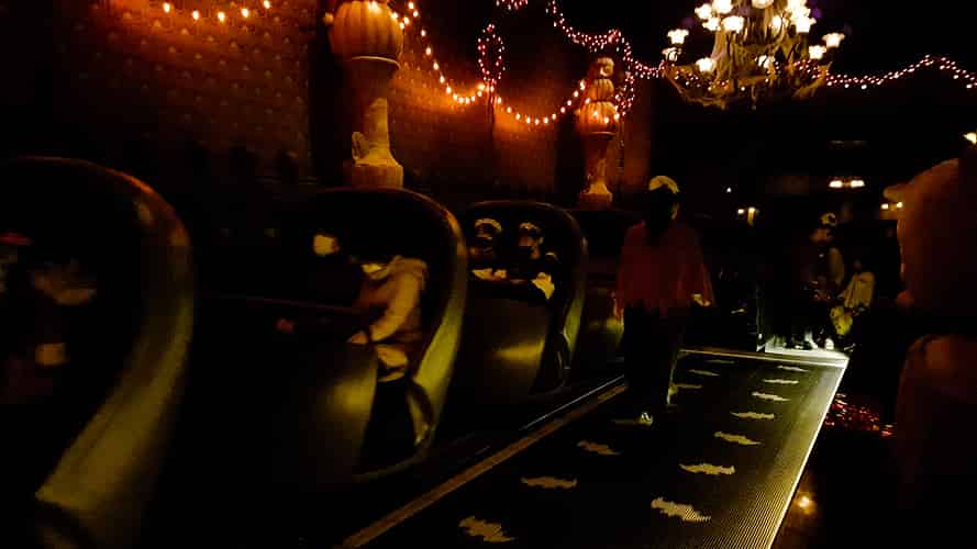 Riders sit in "doom buggies" for their tour of the mansion.