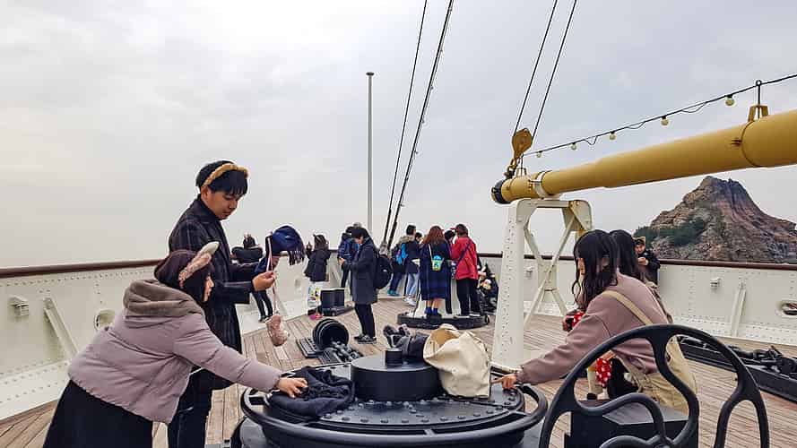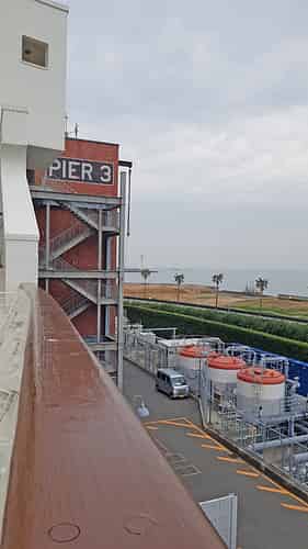 A stage area is located next to the ship.