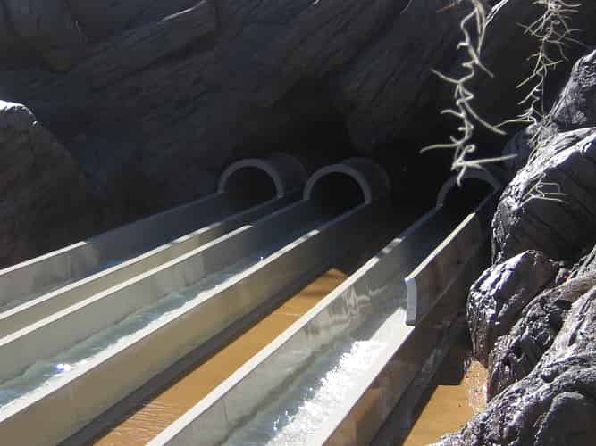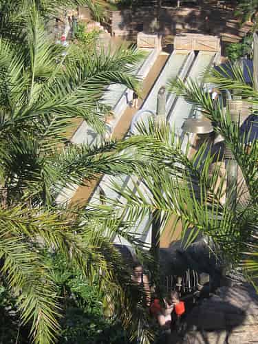 Poweful jets of water propel the rafts on the uphill sections. The water follows a different trajectory to the riders, so at the top it is akin to being shot in the back by a fire hose.