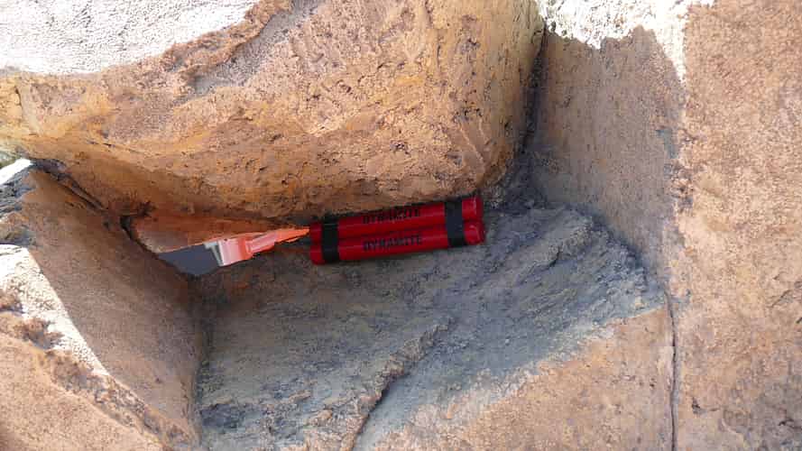 Themeing has begun to show up in the final trench. Debris from the blasted tin roof has fallen to the bottom of the trench.