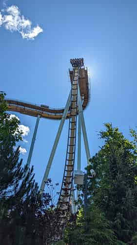 The train is then released down the drop, reaching speeds of 105 km/h.