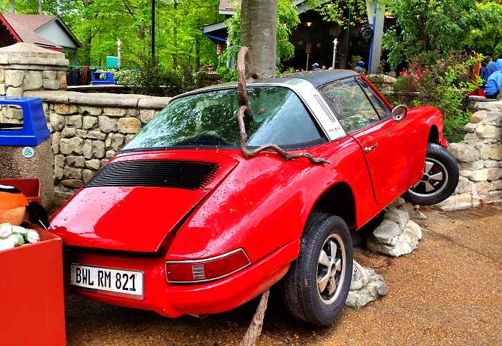 A Porche overrun by woody vines suggests the Black Forest is somewhat sinister.