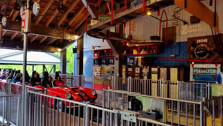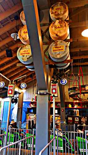 Boarding of the ride takes place in a disorganised workshop. Two trains can load simultaneously.