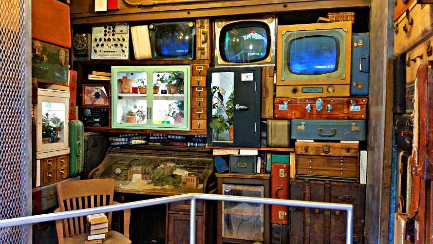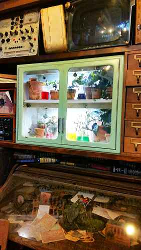 The second part of the queue passes through a workshop, where it seems the owner is deliberately trying to make the forest grow wild, and is watching the results on CCTV.