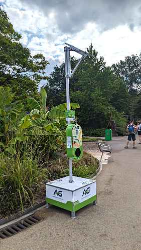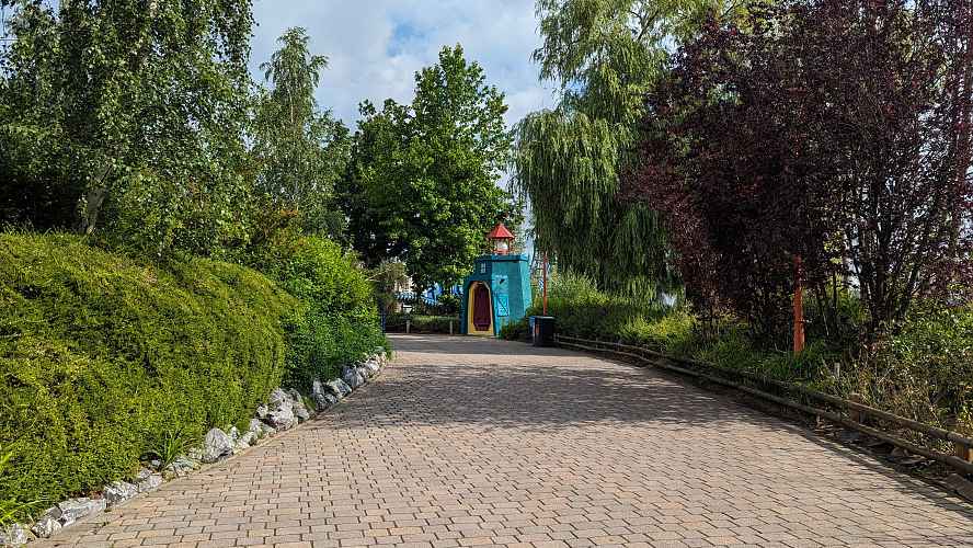 A rotunda near the park entrance at a split in the main path. The park is arranged in a loop around a lake.