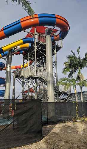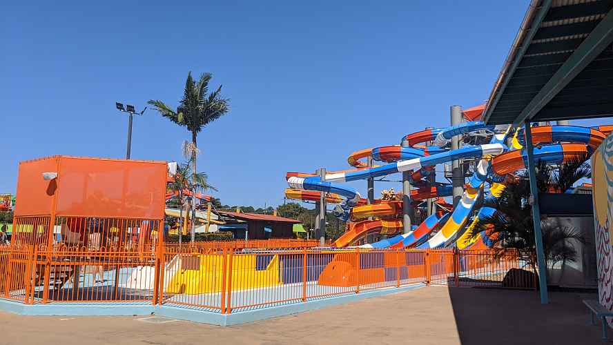 The complex features two open air body slides, two freefall slides, an enclosed slide, and one which starts enclosed and finishes open air.