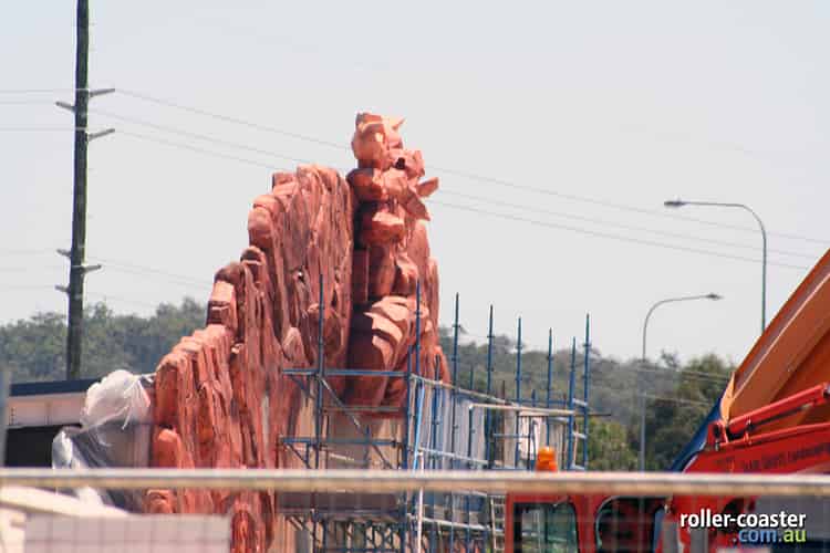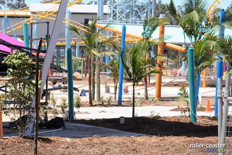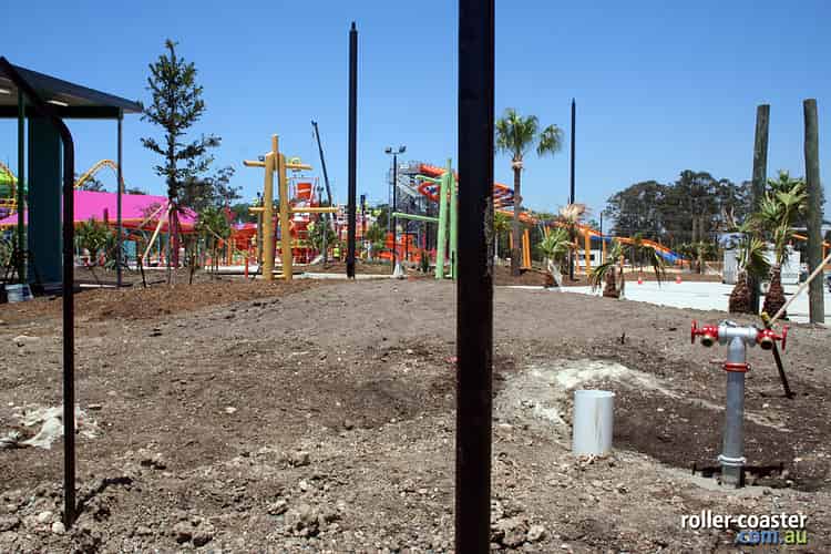 Landscaping is well underway, crafting the construction site into a lush tropical water park. Lighting poles also dot the grounds.