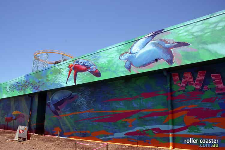 A mural based on the park's beach theme has been painted along the outside edge of this building.