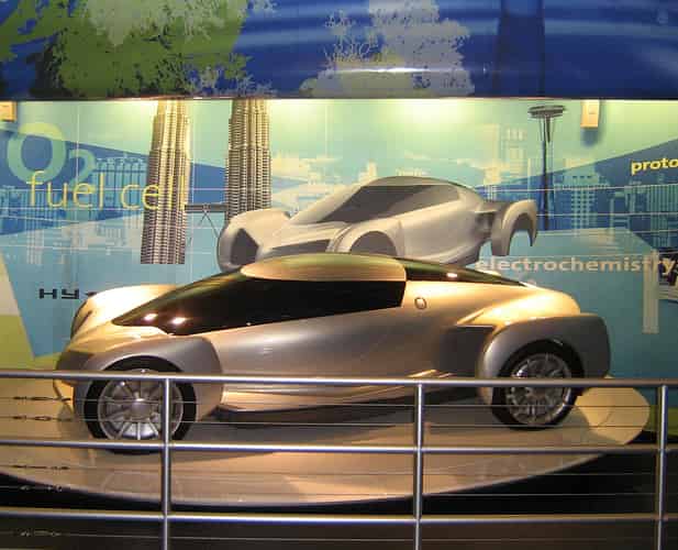 The exit area is also an exhibition and advertising space for GM products. Shown here is a hydrogen car.