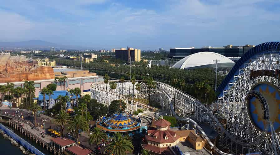 Overlooking paradise pier, with King Triton's Carousel and California Screamin'.