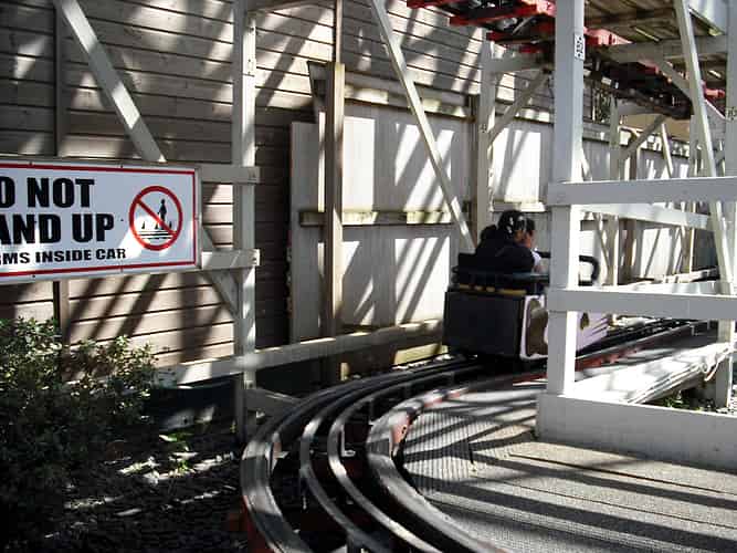 Like all wooden wild mouses, the cars don't have upstop or side friction wheels. Instead, a greased peg running between the central rails keeps the cars on track.
