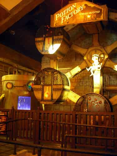 The exits of both Shrek 4D and Donkey, Live! flush out into Fairy Godmothers Potion Shop, which contains Magic Potion Spin, a kids ferris wheel.