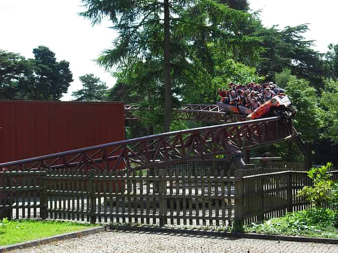 The ride had to be shoehorned in between the Skyride and the now removed Corkscrew coaster, meaning an awkward hairpin turn after the main brake.