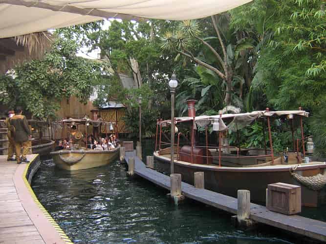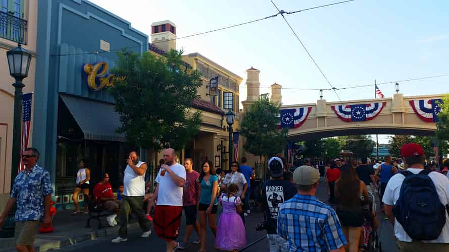 Looking back towards the main entrance. The bridge with american banners carries the monorail, A stylised replica of the golden gate bridge previously stood here.