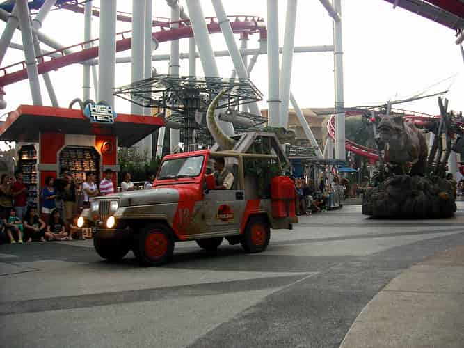 Many of the floats are based upon attractions at the park, such as this Jurassic Park jeep transporting a small dinosaur in an even smaller cage.