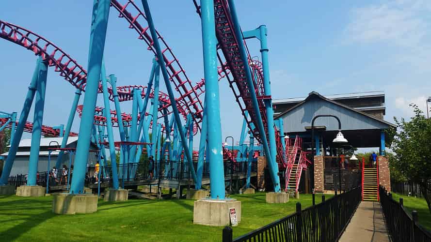 The final helix is behind the ferris wheel, and is the fastest part of the ride.