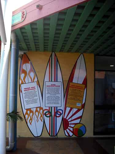 Heading further up the ramp, there is some surfboard themed signage. One of the boards is clearly aqualoop inspired, and another has the Japanese Naval insignia.