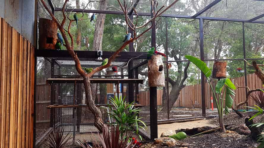 Eclectus parrots are housed in the smaller cages near the start of the Wildlife Trail.