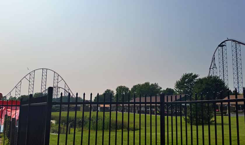 Joker's Jinx launches a train of 20 riders through a tunnel a spaghetti bowl of track featuring 4 inversions.