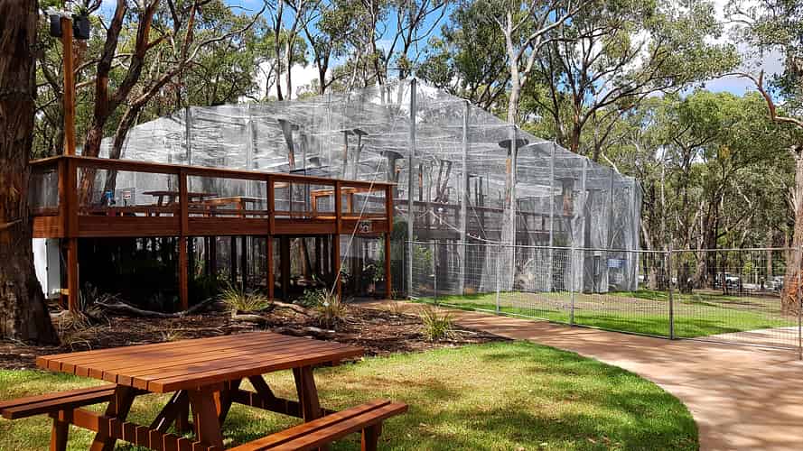 The aviary is a bit industrial looking, constructed of chainlink mesh.