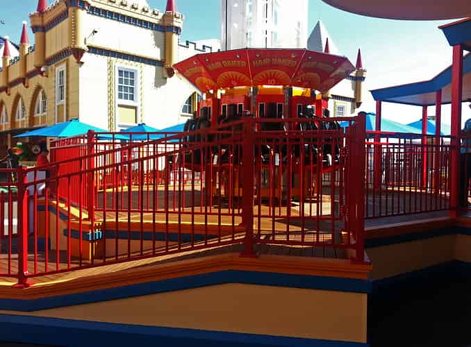 In order to conserve space in this tiny park, many of the rides are built atop others. Tumble Bug is found above the Dodgem cars.