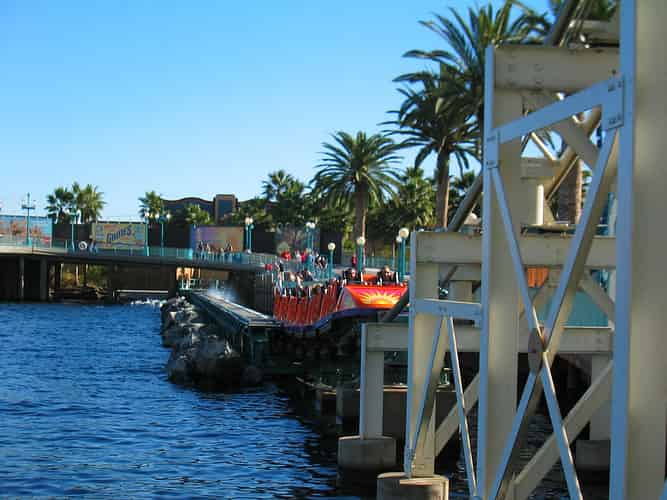 The water under Pacific Wharf acts as Grizzly River Run's overflow pool, creating the added thematic benefit of the image of tides.