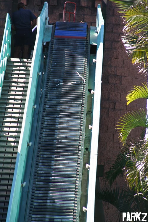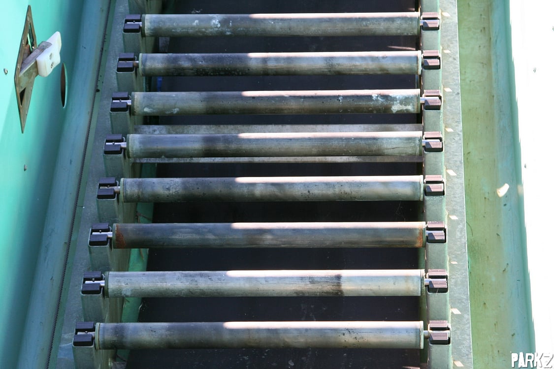 A closeup of the flume ride's conveyor belt rollers. Any former Arrow Dynamics engineers reading this are probably thinking to themselves that looks familiar!