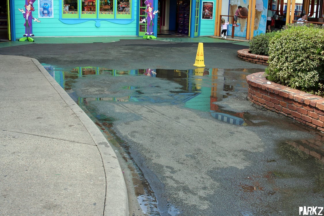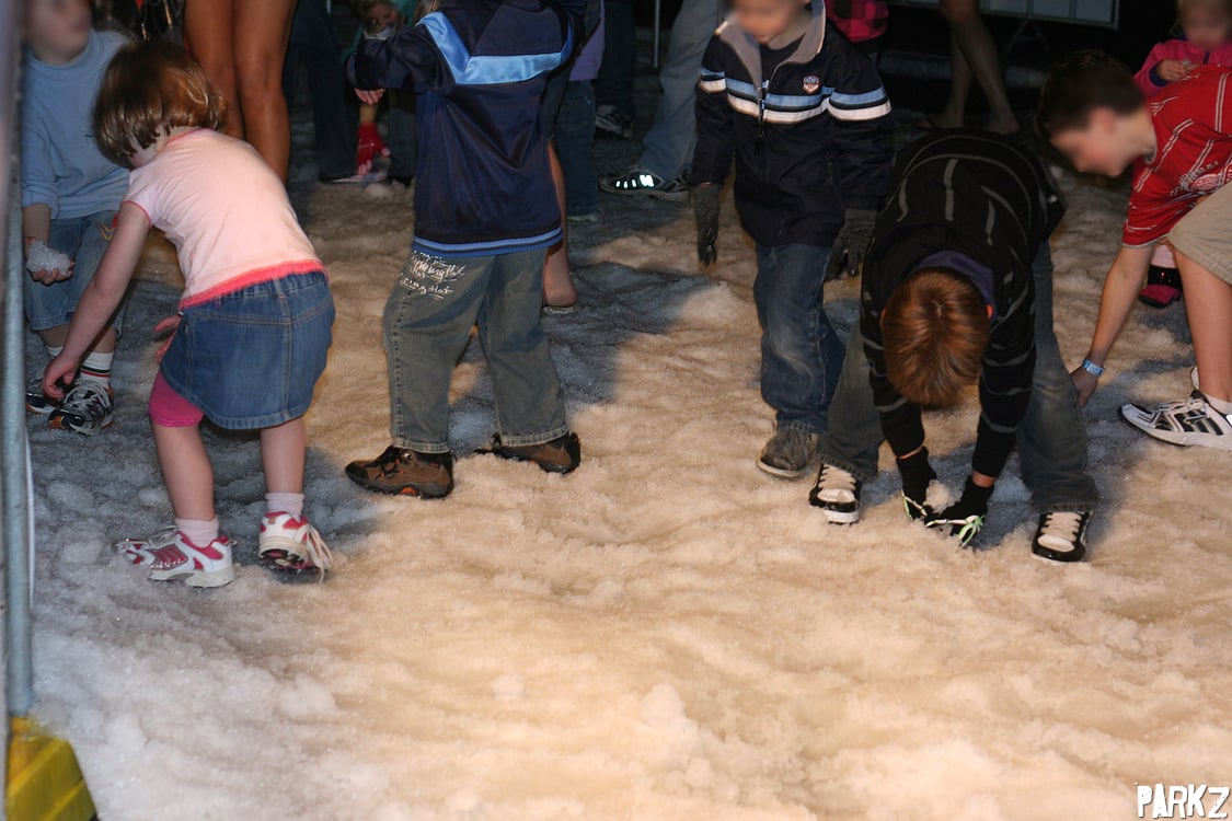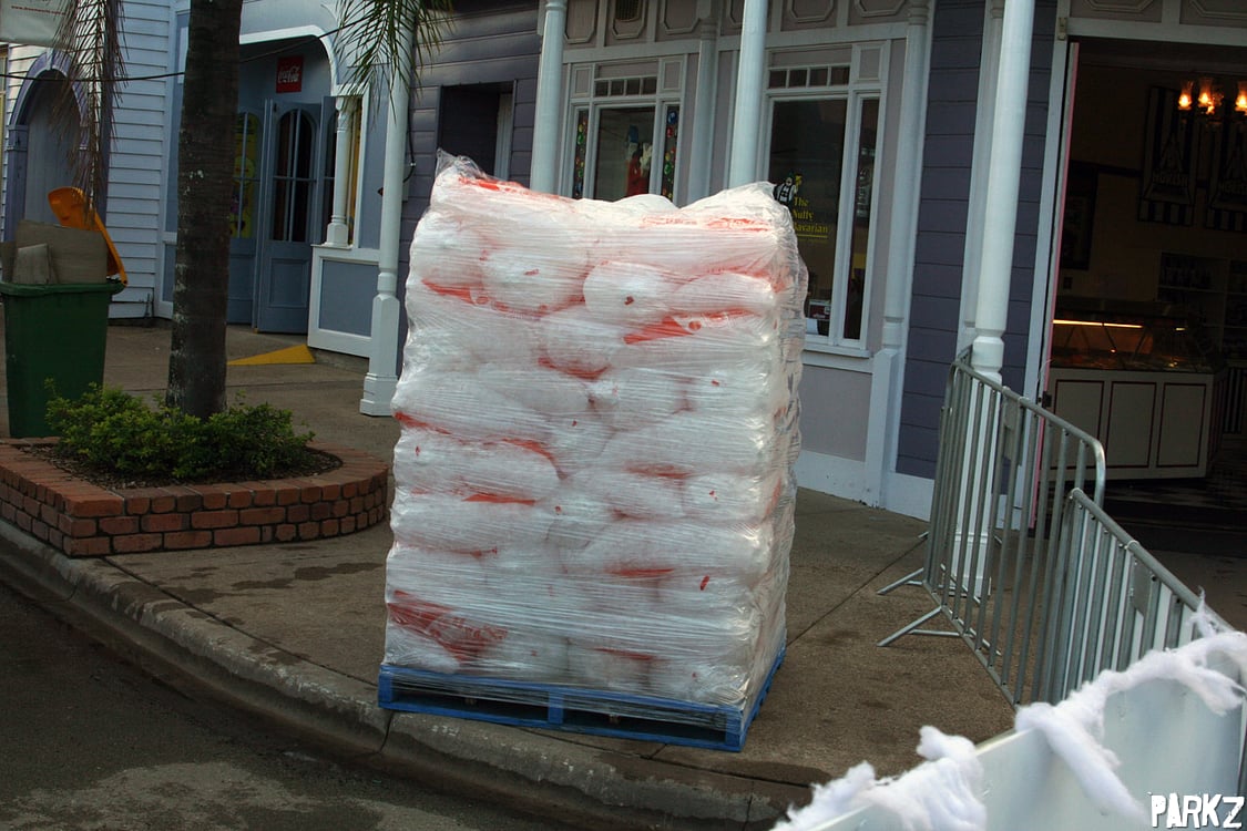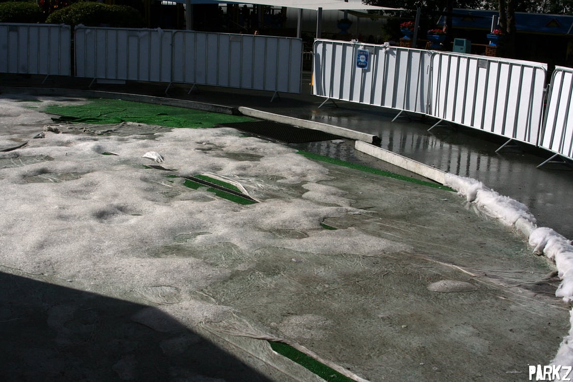 Guests are greeted in the park by the remains of the previous night's "snow" melts away.