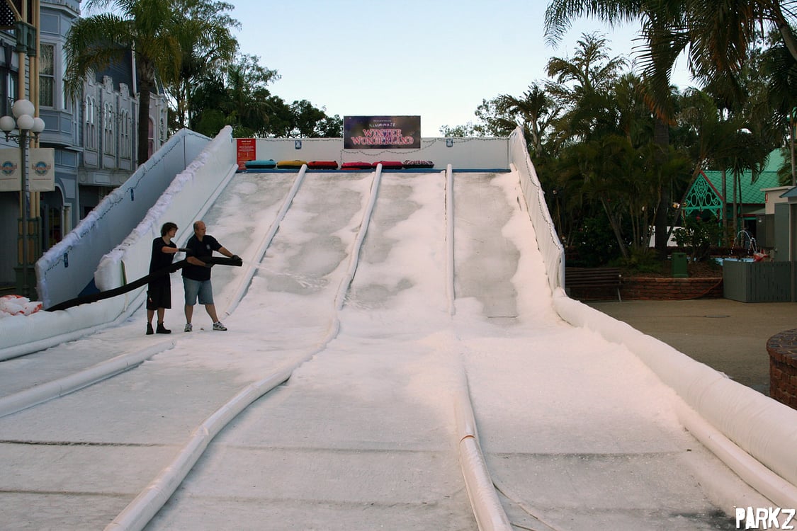As the day draws to a close, Dreamworld prepares for the night's Winter Wonderland.