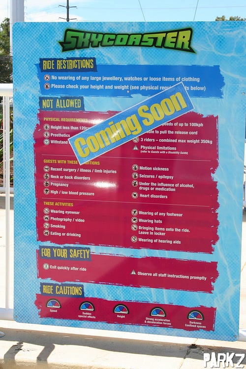 Signage is all in place ready for the ride's opening. Though if someone knows what darkness and confined spaces there are on a Sky Coaster, please let us know!