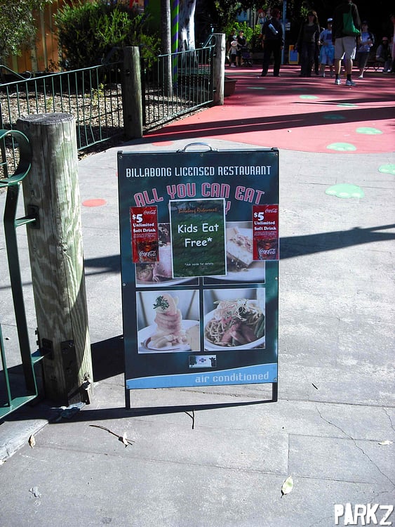 Unfortunately we can't fully make out what the fine print says. Being a theme park, it's safe to assume it says "Kids Eat Free* ... *No they don't."