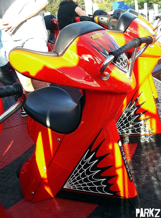 Riders sit in a saddle, and press up against a front panel, a padded T bar sits in a recess below the seat at the back. The T bar swings up 180 degrees automatically and presses against your back, keeping you restrained. It's an automatic system, so it tries to keep applying pressure throughout the ride.