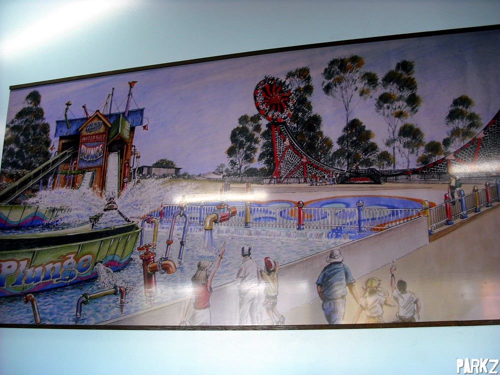 Earlier reports of a flume ride coming to park are indeed true. At the ticket counter there is a large bit of concept art for "Water Shed Plunge", a compact flume ride and water play area.