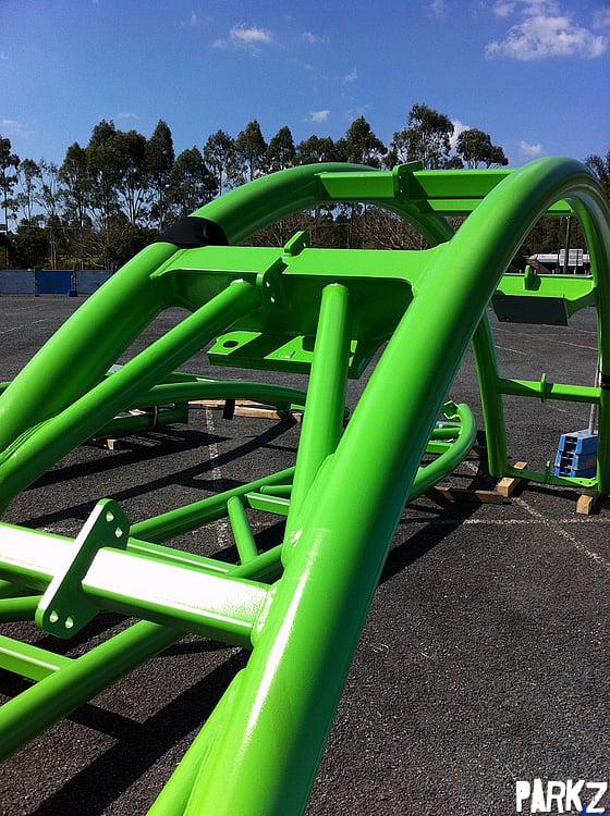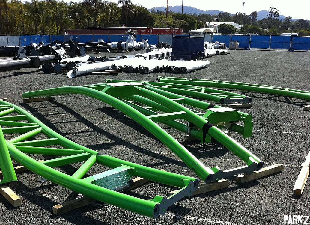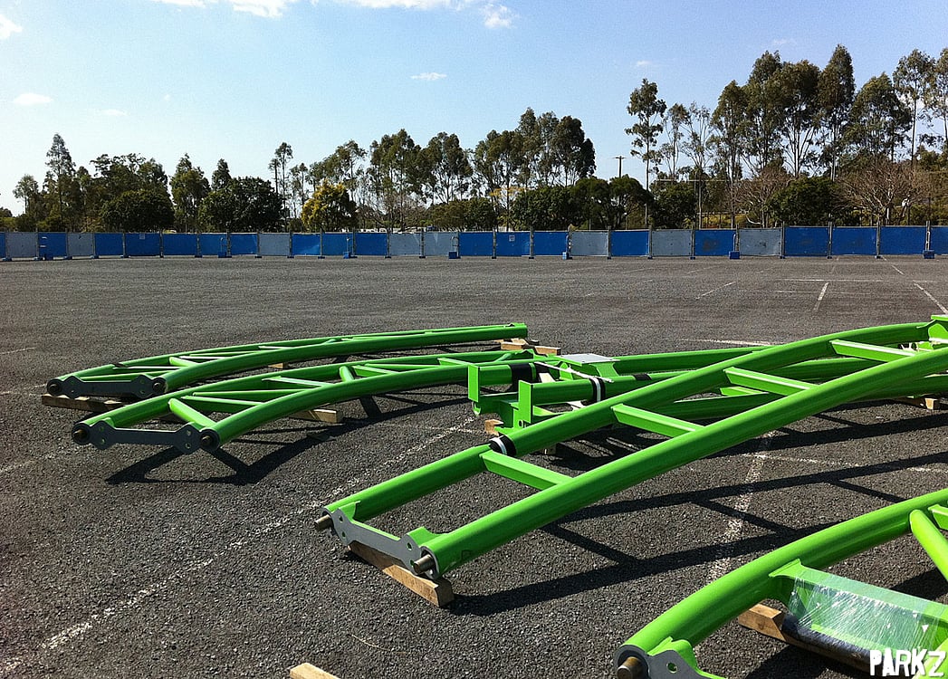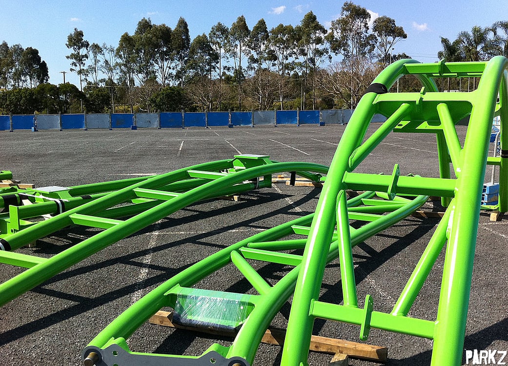 As construction gets started on Movie World's latest coaster due open late 2011, we take a look at the first pieces of lime green track as they arrive.