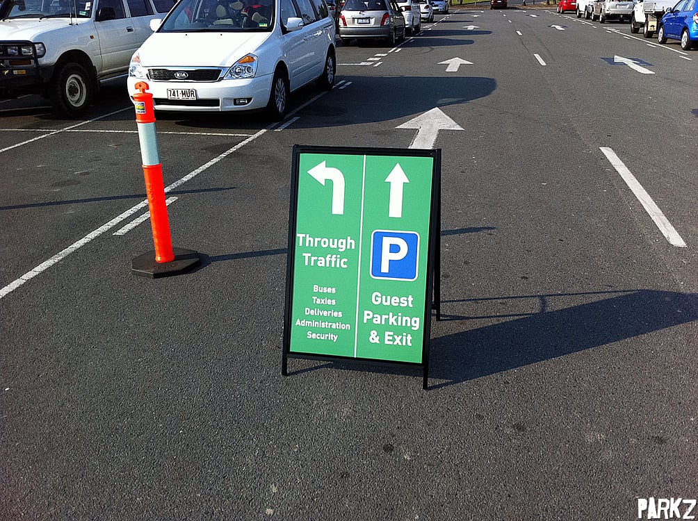 With Green Lantern's track and supports being stored on the carpark and park entrance road, green signage directs traffic to safety.