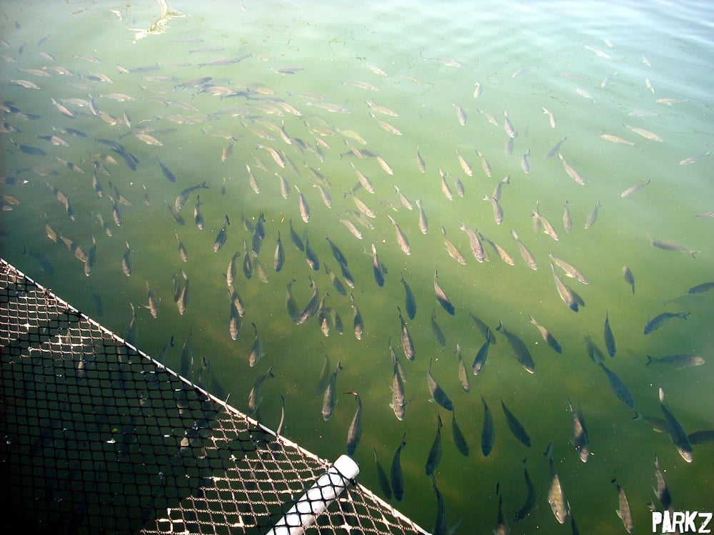A photo of the school of fish that congregates around a certain well known food dispenser means only only one thing...We're at Sea World!