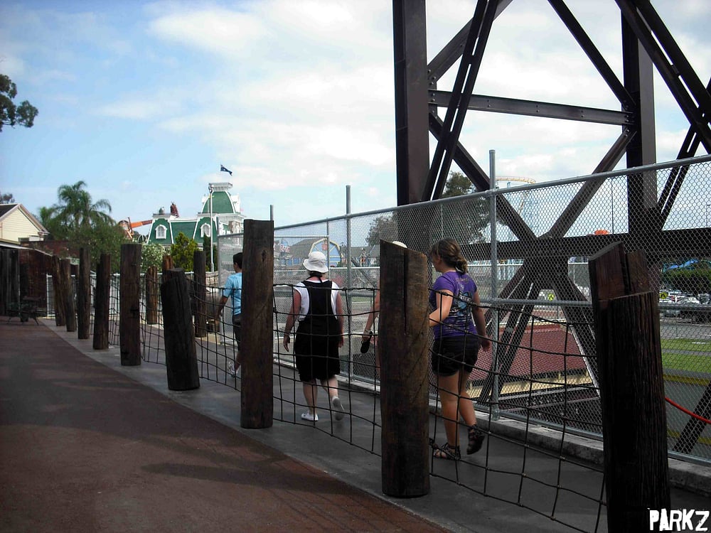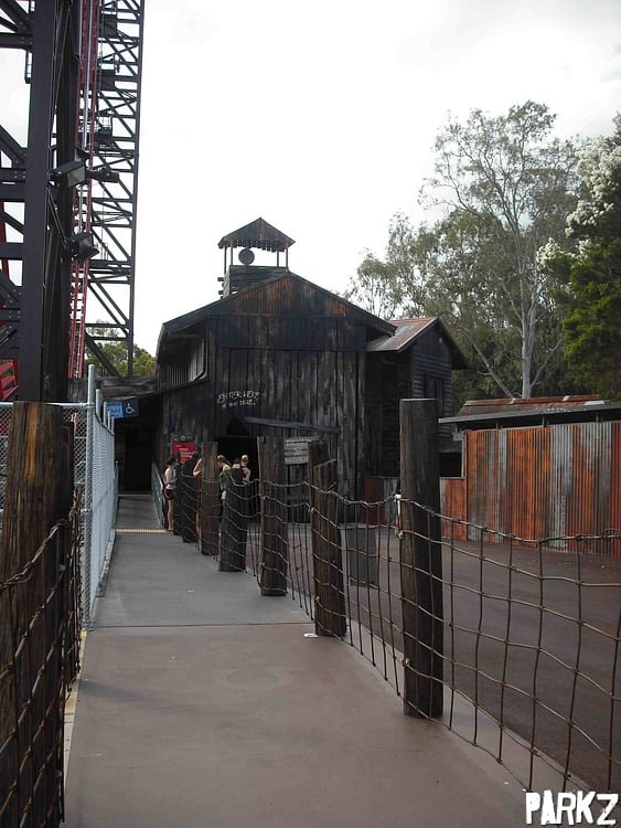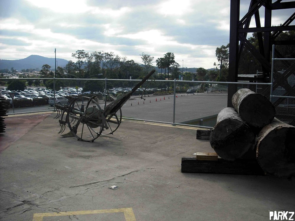 This helipad used to be the base for Dreamworlds helicopter joyflights, until an underfull fuel tank turned it into Australia's tallest freefall ride. Now the helipad has had some logging related theming chucked on it.