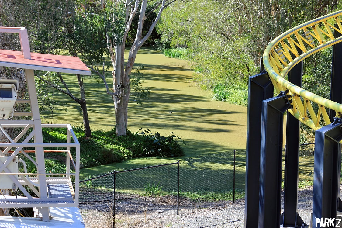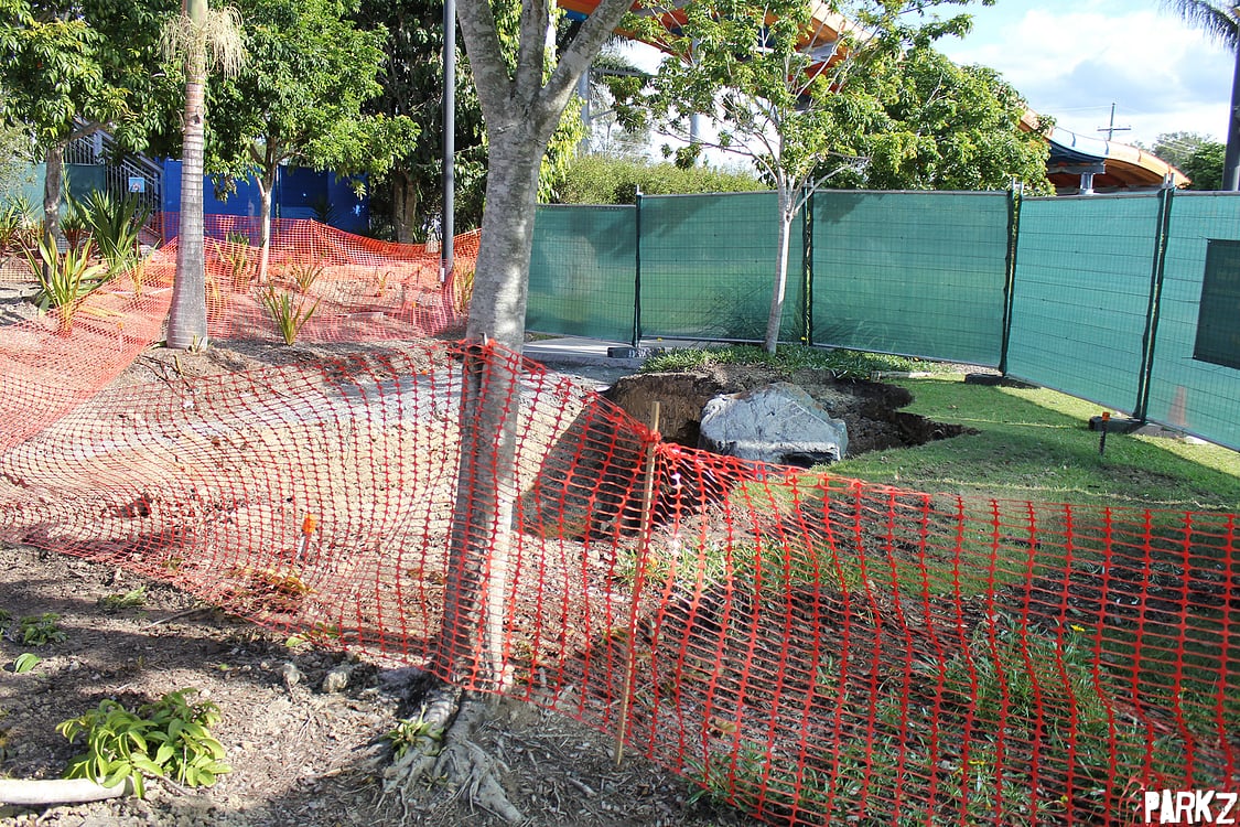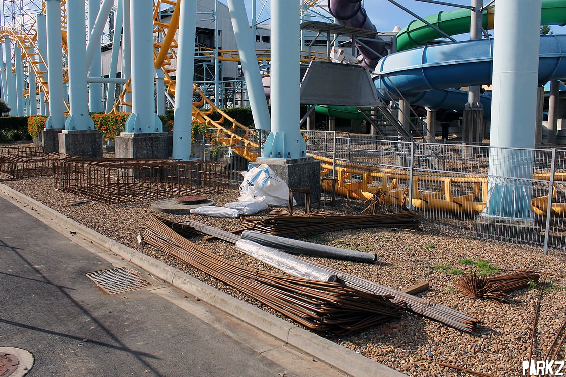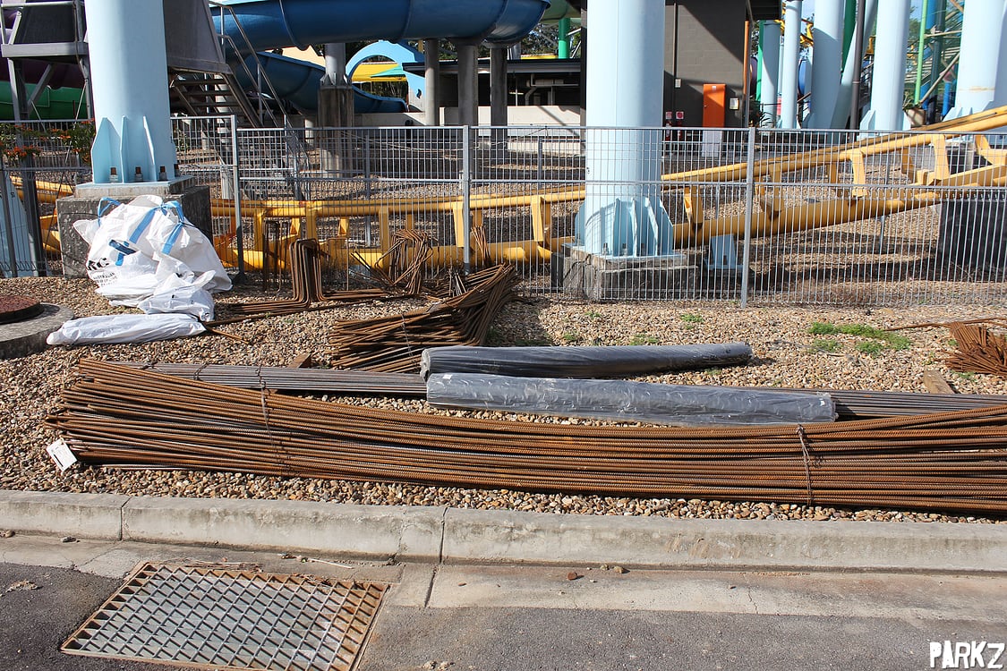 The back-of-house service road has become a storage area and a temporary access route for the Little Rippers and Temple of Huey slides.