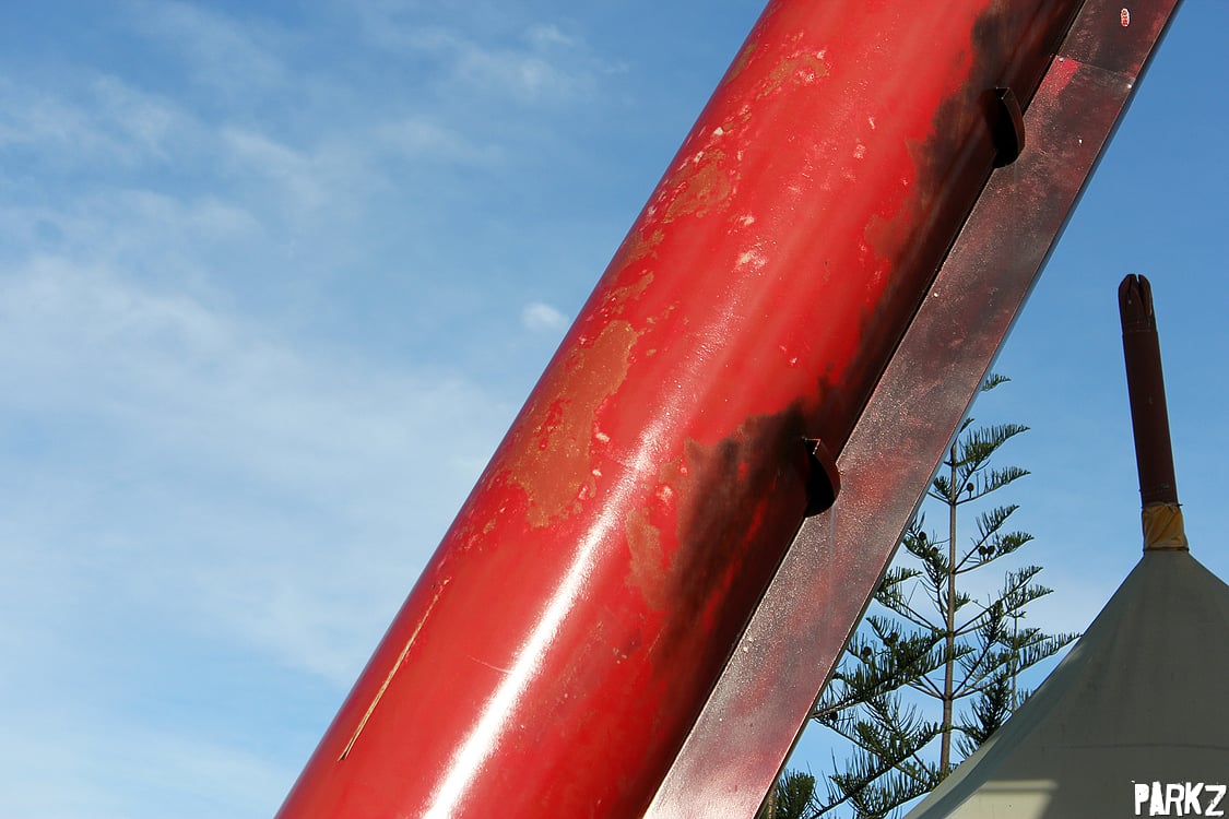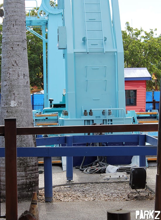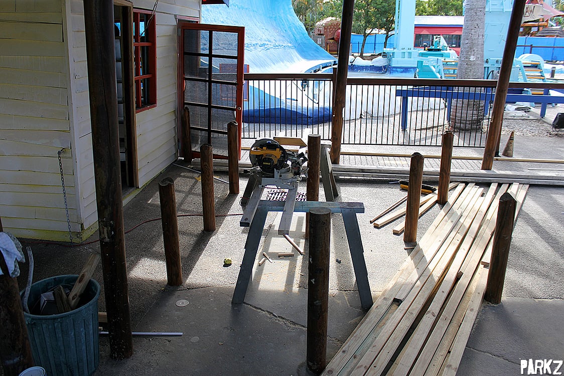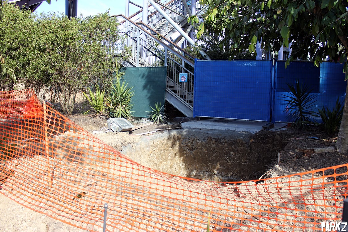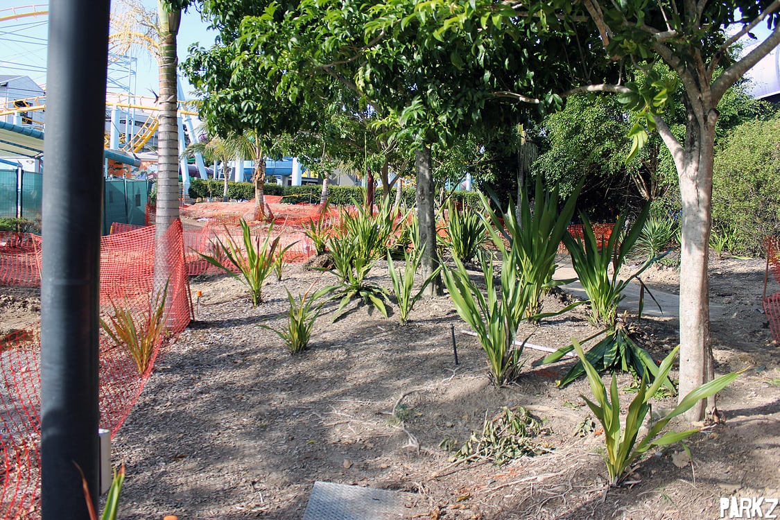 The back-of-house service road has become a storage area and a temporary access route for the Little Rippers and Temple of Huey slides.