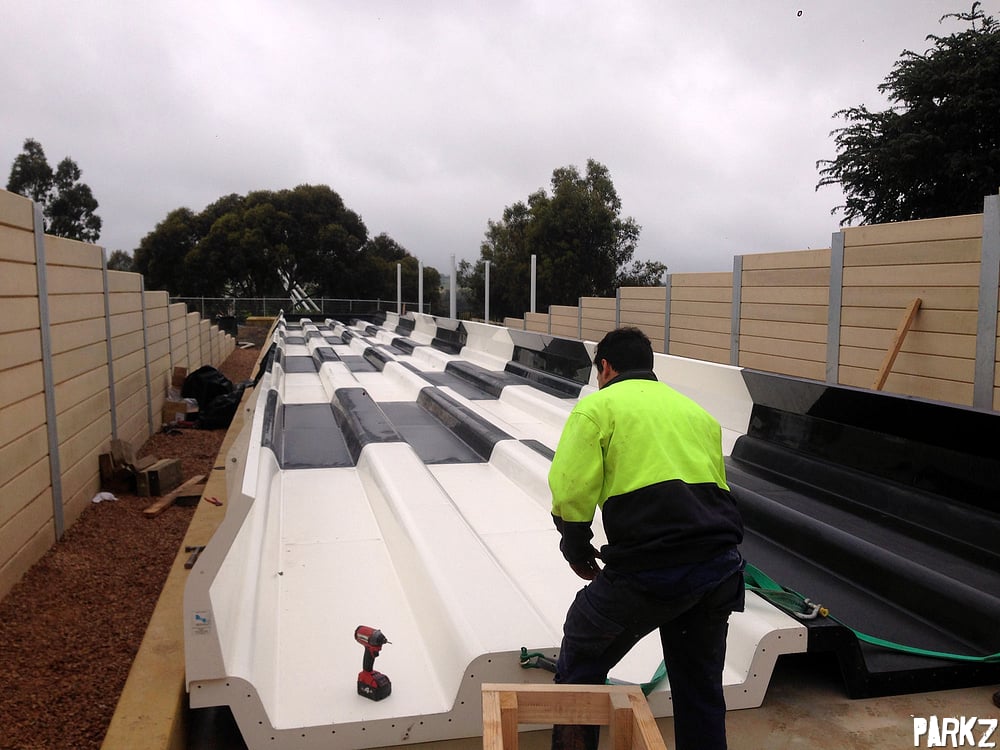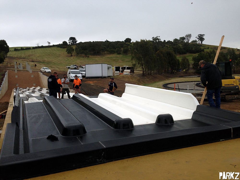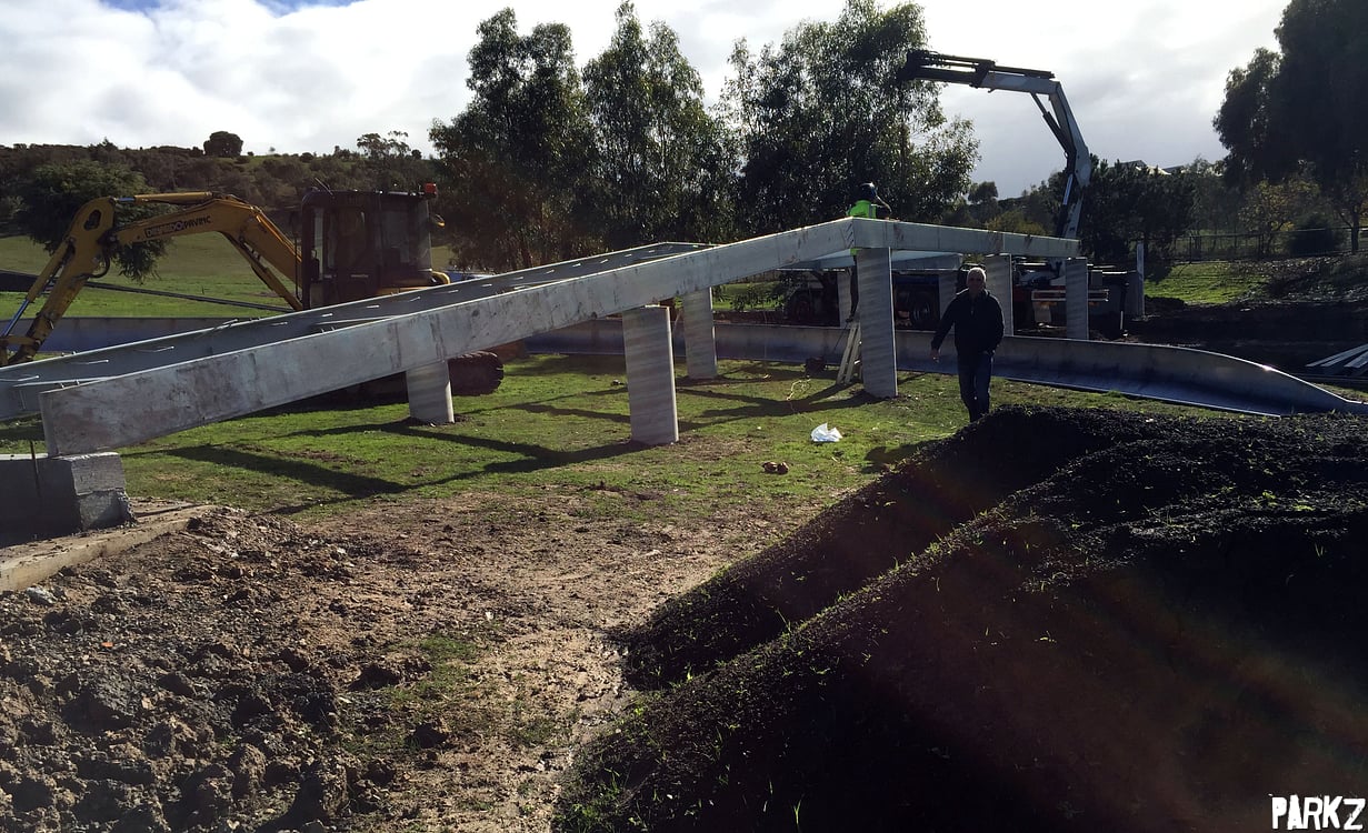 Late October saw the slide pieces start to arrive from Proslide. Piece by piece the 4-lane racer was constructed, starting with the large racing lane sections.